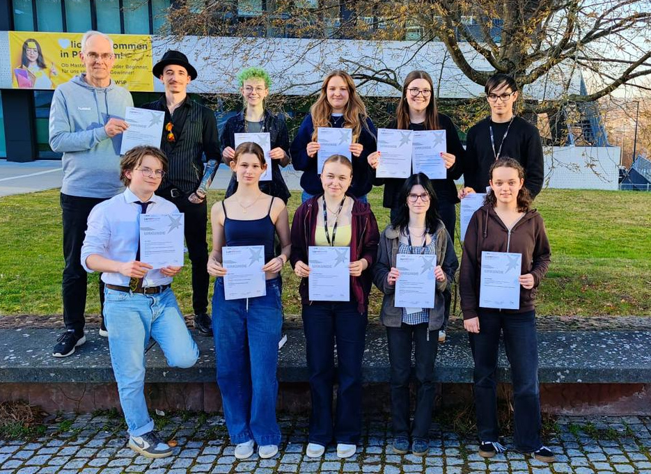 Neben den betreuenden Lehrkräften Bernd Kulick (links oben) und Florian Kirschenmann (daneben mit Hut) hat sich dieses Jahr unsere Schülerin Olive Gallagher (oben Mitte, grüne Haare, die letztes Jahr abgeräumt und dort sogar den 1. Platz gewonnen hatte) statt mit einem eigenen Projekt anzutreten mit großem Einsatz bei der Betreuung des diesjährigen NExt-Kurses beteiligt. Das ist so besonders, dass sie mit einem für diesen Fall geschaffenen Sonderpreis für engagierte Talentförderung über 100 € bedacht wurde! Wir gratulieren!