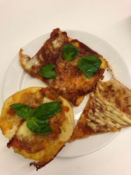 - eine halbfertige Pizza (gekaufter Pizzateig, passierte Tomaten und eine fertige Gewürzmischung) und